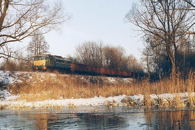 ST44-324 wraz z ST44-1102 prowadzą żwiraka relacji Olecko - Niemojki. Skład na zdjęciu zbliża się do mostu na rzece Ełk i zaraz wjedzie do Ełku.