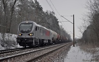 Gama w służbie Pol Miedź Transu z Rail Capital Partners z pociągiem towarowym nr 864040 rel. Recław - Legnica mija wiadukt nad drogą do miejscowego lotniska jadąc w pochmurne popołudnie szlakiem Koźlice - Lubin w stronę Legnicy.