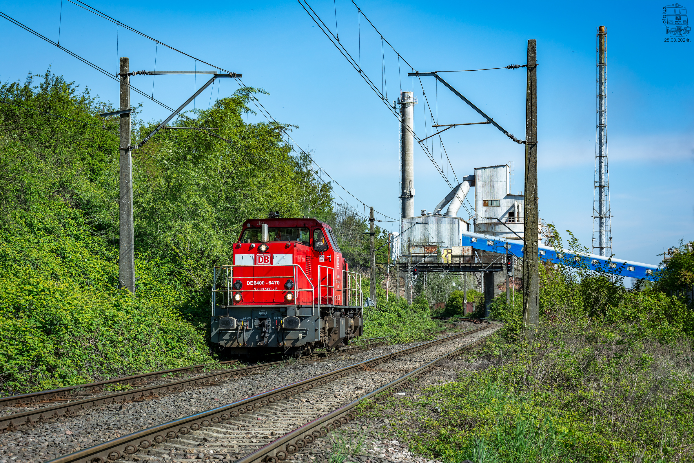 DE6400-6470 o wcześniej wymienionym pseudonimie, zbliża się luzem do stacji Szczecin Gocław. Lokomotywa wcześniej przyprowadziła na Stołczyn skład składający się z bagatela jednej beczki ;), a teraz wraca zapewne na Port Centralny, gdzie ma bazę. Jak widać po niebie promienna pogoda dopisywała, jak i temperatura, lecz szczerze mówiąc nie sądziłem że na tyle, aby wrócić do domu z całymi opalonymi rękoma i nogami...