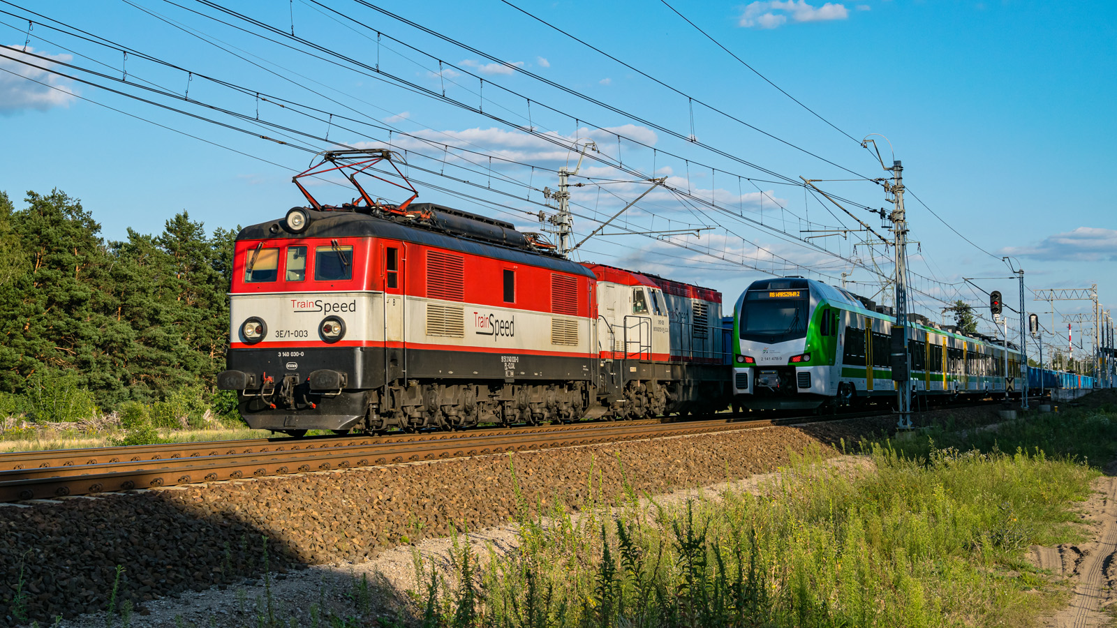Flirt3 (ER160-27) z KM 91708 R6 relacji Tłuszcz-Warszawa Zachodnia i 3E/1-003 & SM31-009 TrainSpeed z węglarkami jadą linią kolejową numer 449. Mijanka miała miejsce nieopodal przystanku osobowego Warszawa Mokry Ług.