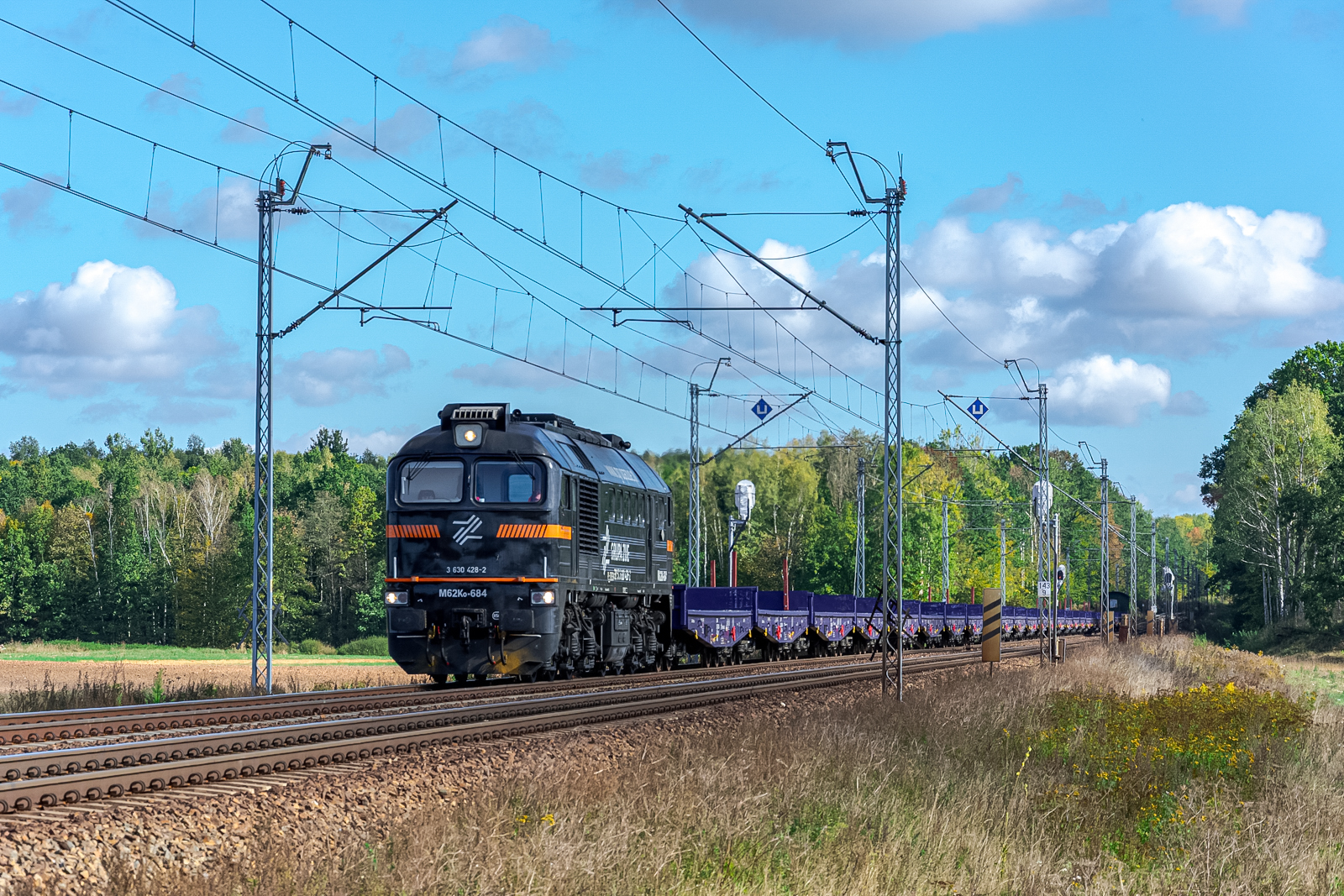 Kołomna z próżnym składem platform oraz wagonem socjalnym na końcu składu zbliża się do stacji w Kochanowicach jadąc szlakiem Lisów - Kochanowice w stronę Lublińca.