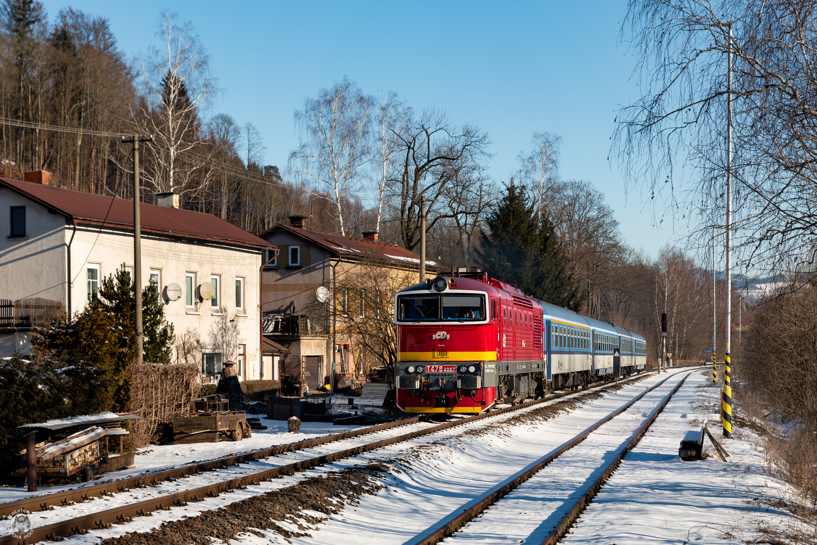 Maszyna na co dzień jest zatrudniana do prowadzenia Rychlików "Krakonoš" na odcinku Trutnov - Hradec Králové, a do szopy w Trutnovie przyjechała z Brna w grudniu 2024 roku. Tego dnia szczęśliwie udało się zrobić zdjęcia w zimowej scenerii ze śniegiem co ostatnio jest jednak rzadkością.