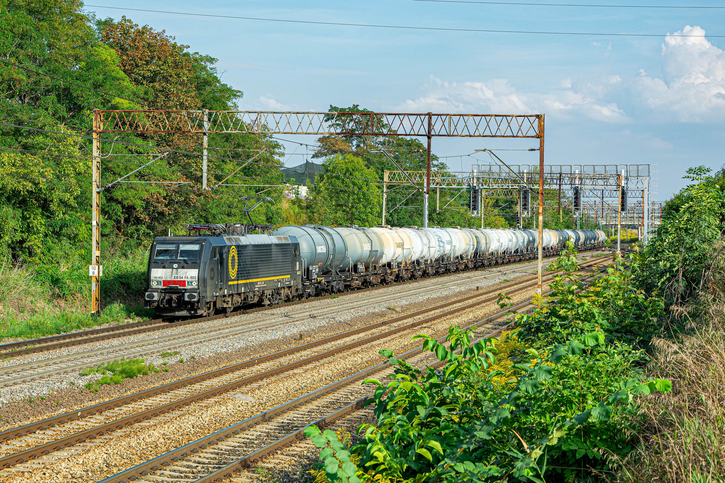 Lokomotywa 189 802 prowadzi skład cystern przez stację Poznań Starołęka w stronę Lubonia k/ Poznania.