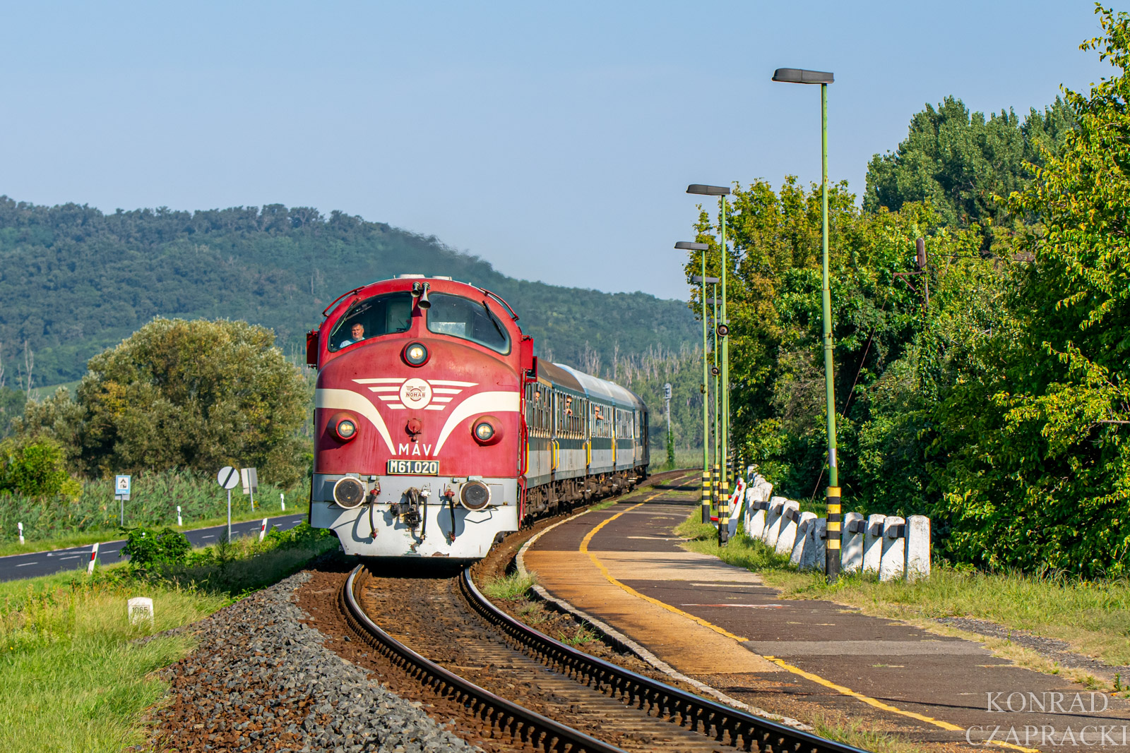 M61.020 z pociągiem 19787 Tapolca-Balatonfüred mija przystanek Badacsonylábdihegy. Nohab został zatrudniony z okazji weekendu retro nad Balatonem
