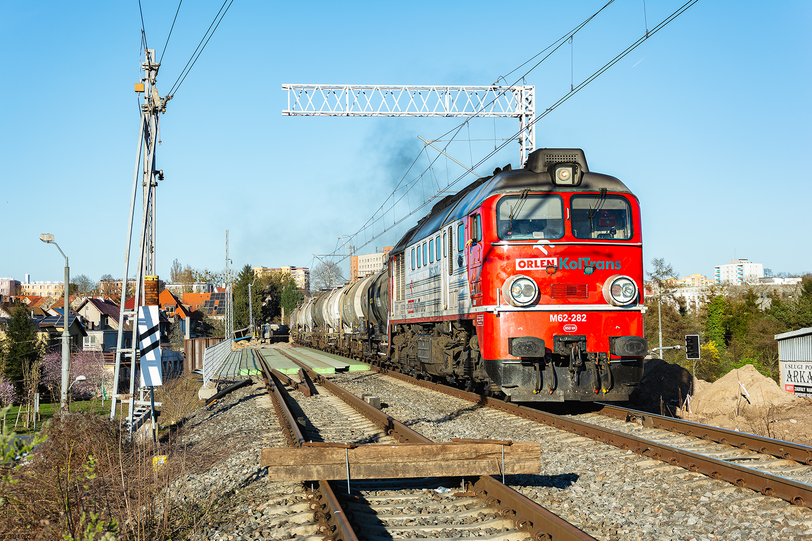M62-282 został tego dnia uwieczniony podczas przejazdu przez zielony wiadukt na ul. Niemierzyńskiej z krótkim składem beczek z Polic Chemii do Wierzbna.