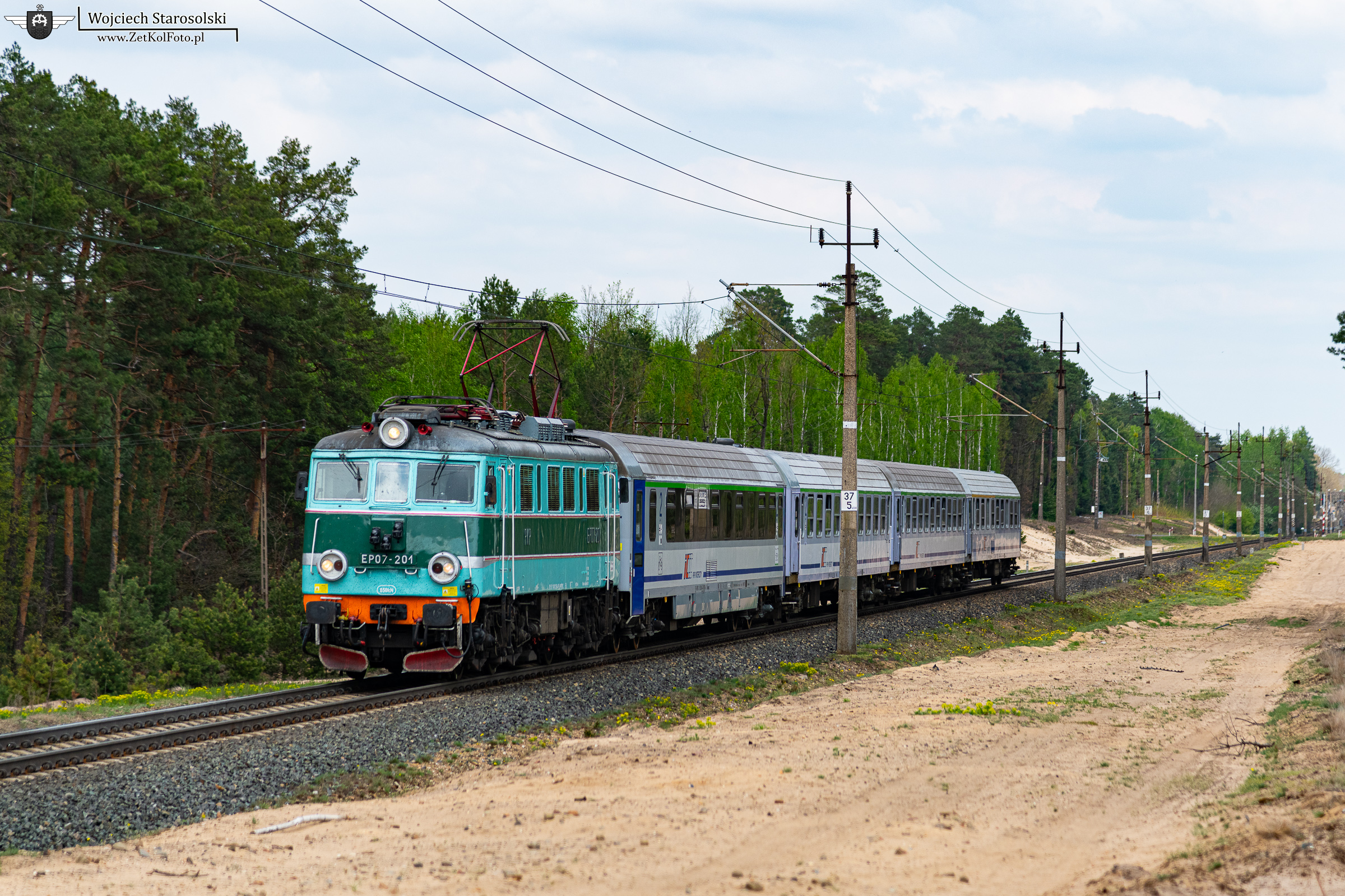 EP07-201 z pociągiem TLK Flisak do Katowic, pokonuje szlak Gostynin-Łąck, jadąc w kier.Gostynina.