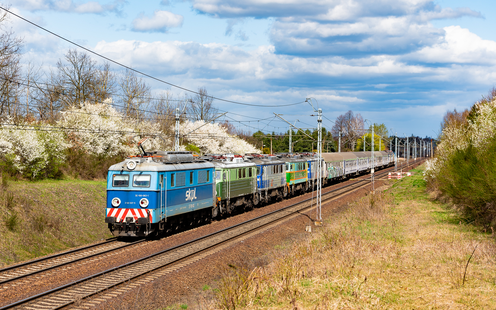 Pociąg 533000/1 rel. Gdynia Grabówek - Chrzanów przemierza szlak Wyczerpy - Częstochowa. Na czele 3E-100-063, EP07-338, EP07-389, EP07-376 i EP07-329, natomiast za wagonami znajdują się EP07-384, EP07-383 oraz SM42-1107.