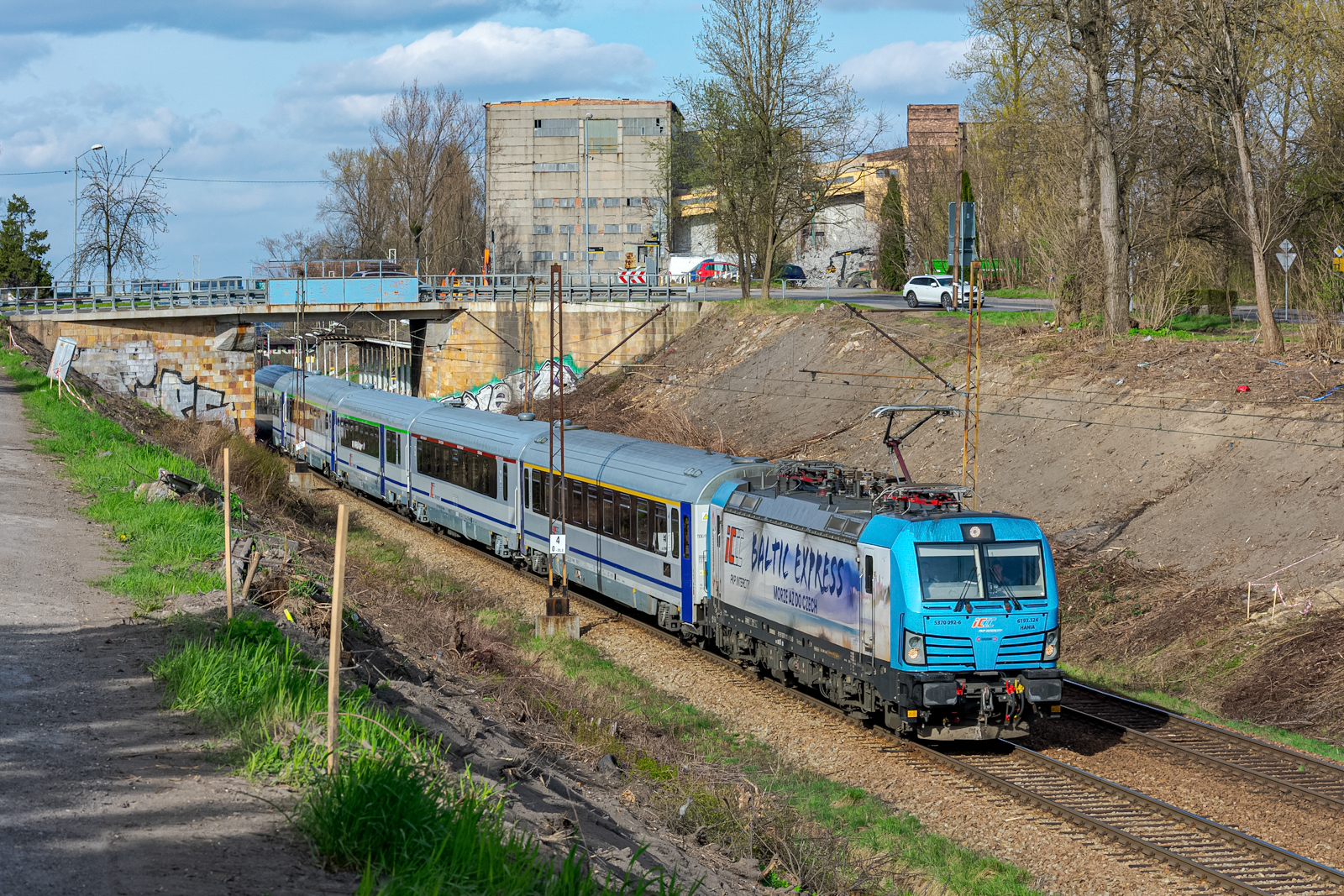 Hania w okleinie Baltic Express w służbie PKP Intercity z Cargounit z międzynarodowym pociągiem IC 14013 / EC 109 Sobieski rel. Warszawa Wschodnia - Wien Westbahnhof mija zabudowania pobliskiej KWK Wujek jadąc szlakiem podg Brynów - Katowice Ligota w stronę Tychów.