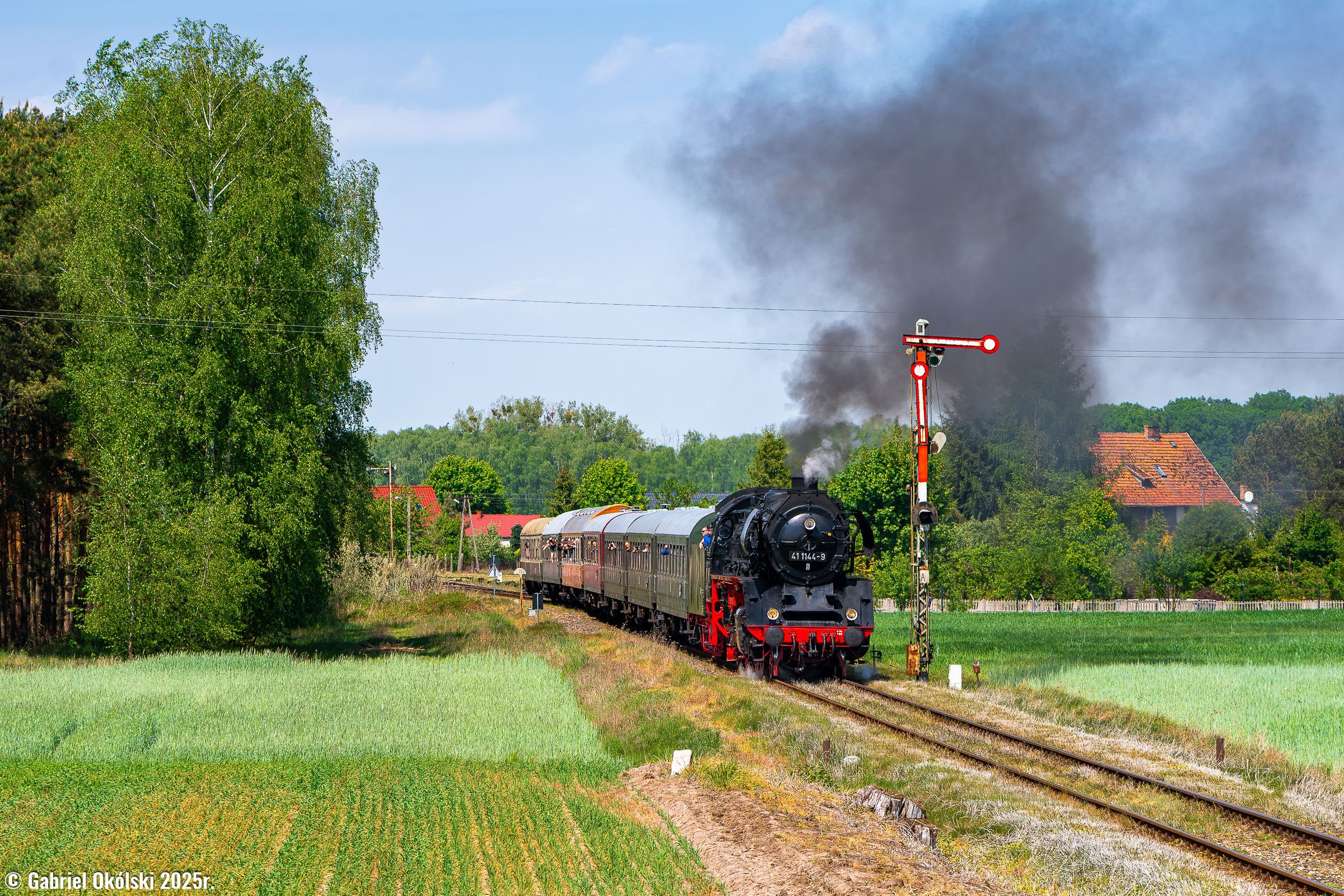 41 1144-9 z pociągiem SDZ "Wojtek-2025" z Leipzig Hbf do Wolsztyna opuszcza Stefanowo. Przejazd zorganizowano z okazji Parady Parowozów. Lokomotywa ciągneła skład dopiero od Cottbus. Wcześniej był to elektrowóz.