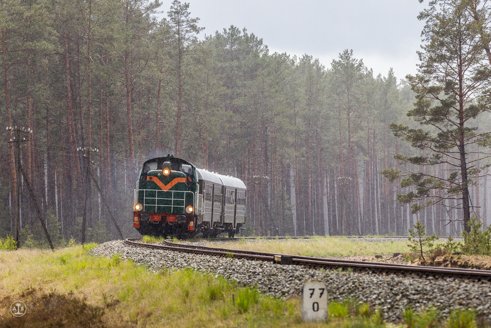 Złapał cię deszcz. Tymczasem w okolicy wsi Dębowiec deszcz właśnie minął a ten pociąg zbliżał się do przejazdu. Pogoda byłą nieprzewidywalna w tym miejscu.