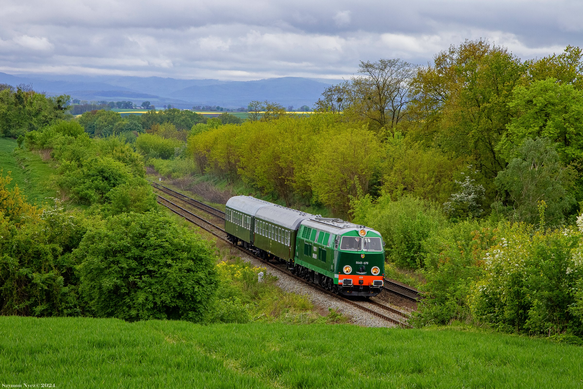SU45-079 z pociągiem specjalnym relacji Wrocław Główny - Kędzierzyn-Koźle, zorganizowanym przez KSK Wrocław, zbliża się do stacji w Głogówku.