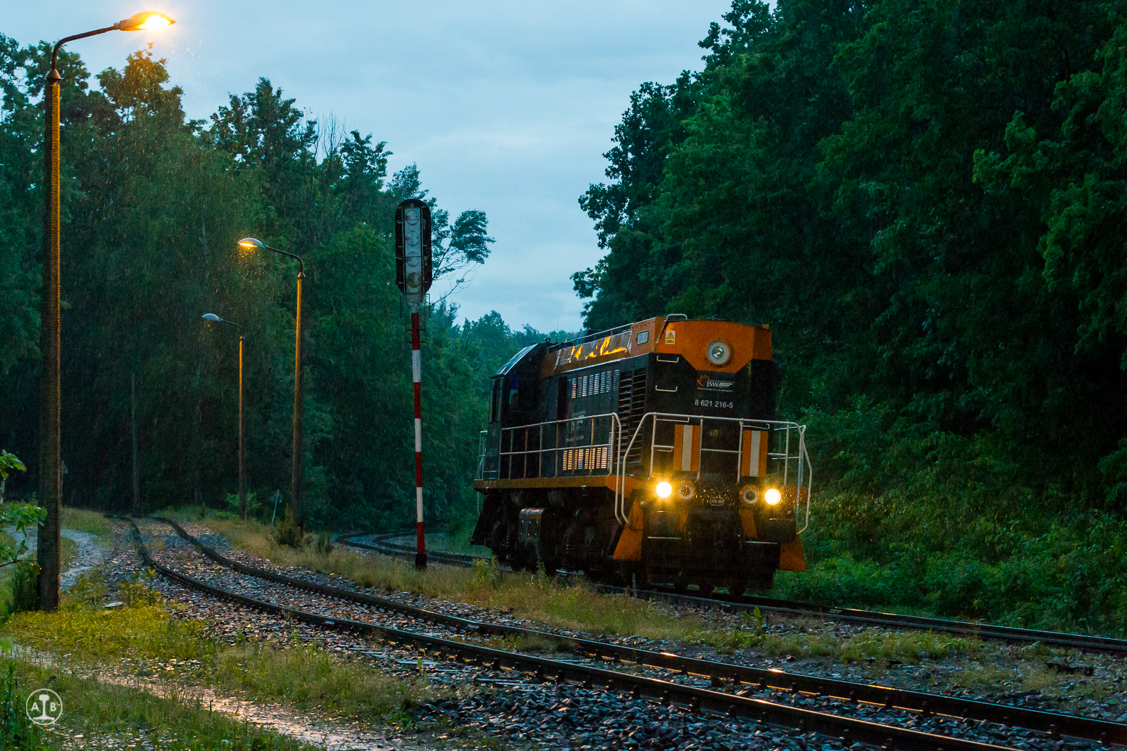 Lokomotywa TEM2-243 należąca do spółki JSW Logistics w ulewnym deszczu zbliża się do podg. Krywałd by tam poczekać na TEM2-288, którą na końcu składu pociągnie wraz z pustymi radwanami do KWK Szczygłowice.