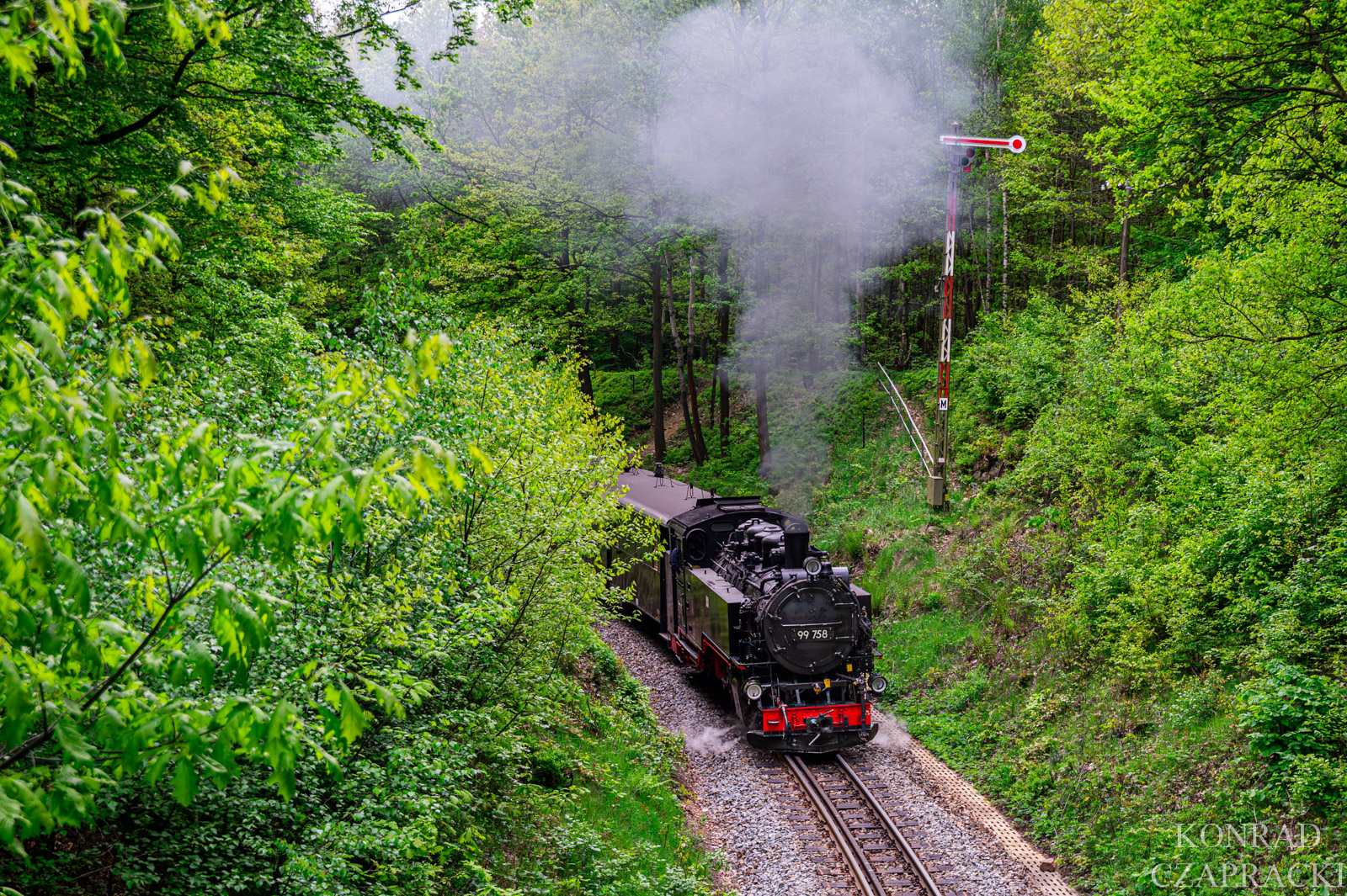 99 758 z pociągiem historycznym do Jonsdorfu opuszcza Bertsdorf, mijając semafor wjazdowy do tejże stacji w charakterystyczny, odwróconym malowaniu.