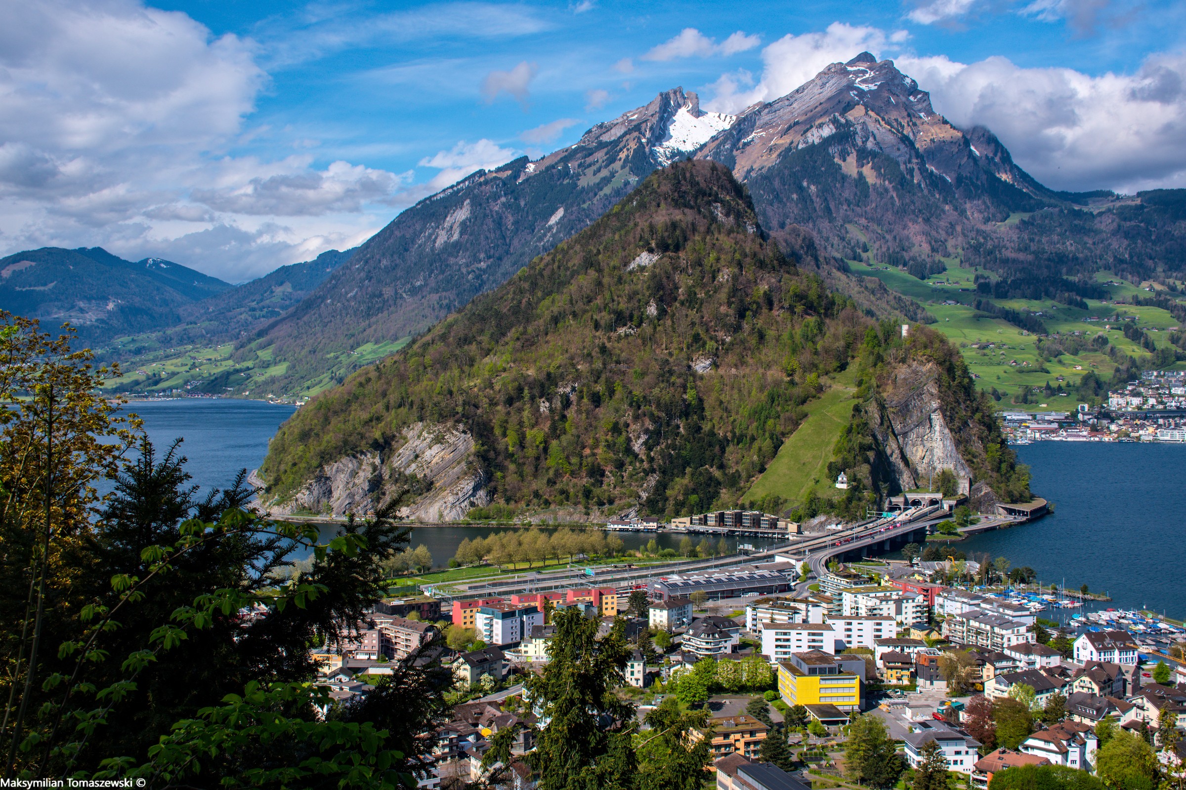 Świąteczny poranek w Stansstad. Elektrowóz serii SBB 101 kolejki Die Zentralbahn prowadzi skład Luzern–Engelberg Express. Pociąg wyjechał właśnie z tunelu kolejowego Lopper II przebiegającego pod wzniesieniem o tej samej nazwie i pokonuje most Acheregg Brücke. Skład za chwilę minie bez zatrzymania stację w Stansstad. Wysoki szczyt w oddali to Pilatus (2,128.5 m). Po prawej widzimy fragment Jeziora Czterech Kantonów, a po lewej fragment Jeziora Alpnach. W centrum kadru widzimy zabudowania Stansstad, w tym halę serwisową pociągów Die Zentralbahn, natomiast budynki w tle po prawej stronie to kawałek miasta Hergiswil.