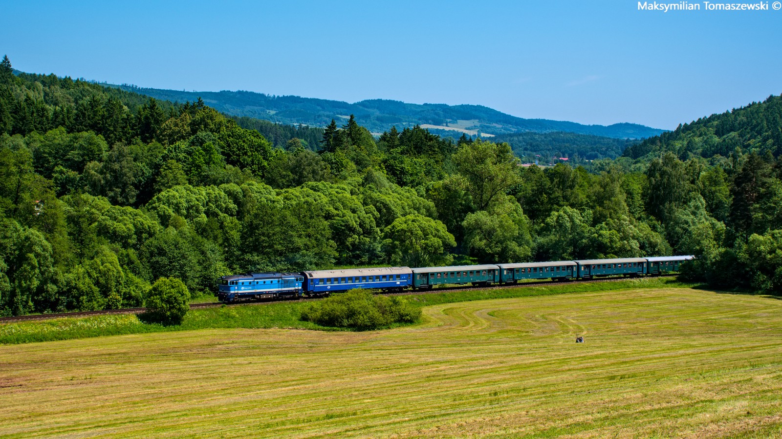 Nurek 754 007-3 prowadzi skład specjalny relacji Broumov - Chocen zorganizowany z okazji 150-lecia kolei Chocen - Meziměstí - Broumov. Pociąg zbliża się do przystanku Hynčice. Na popychu pracuje niewidoczny parowóz 464 202. W oddali widać pasmo Gór Kamiennych po którym przebiega granica polsko-czeska.Dodano: 16.06.2025 12:22
