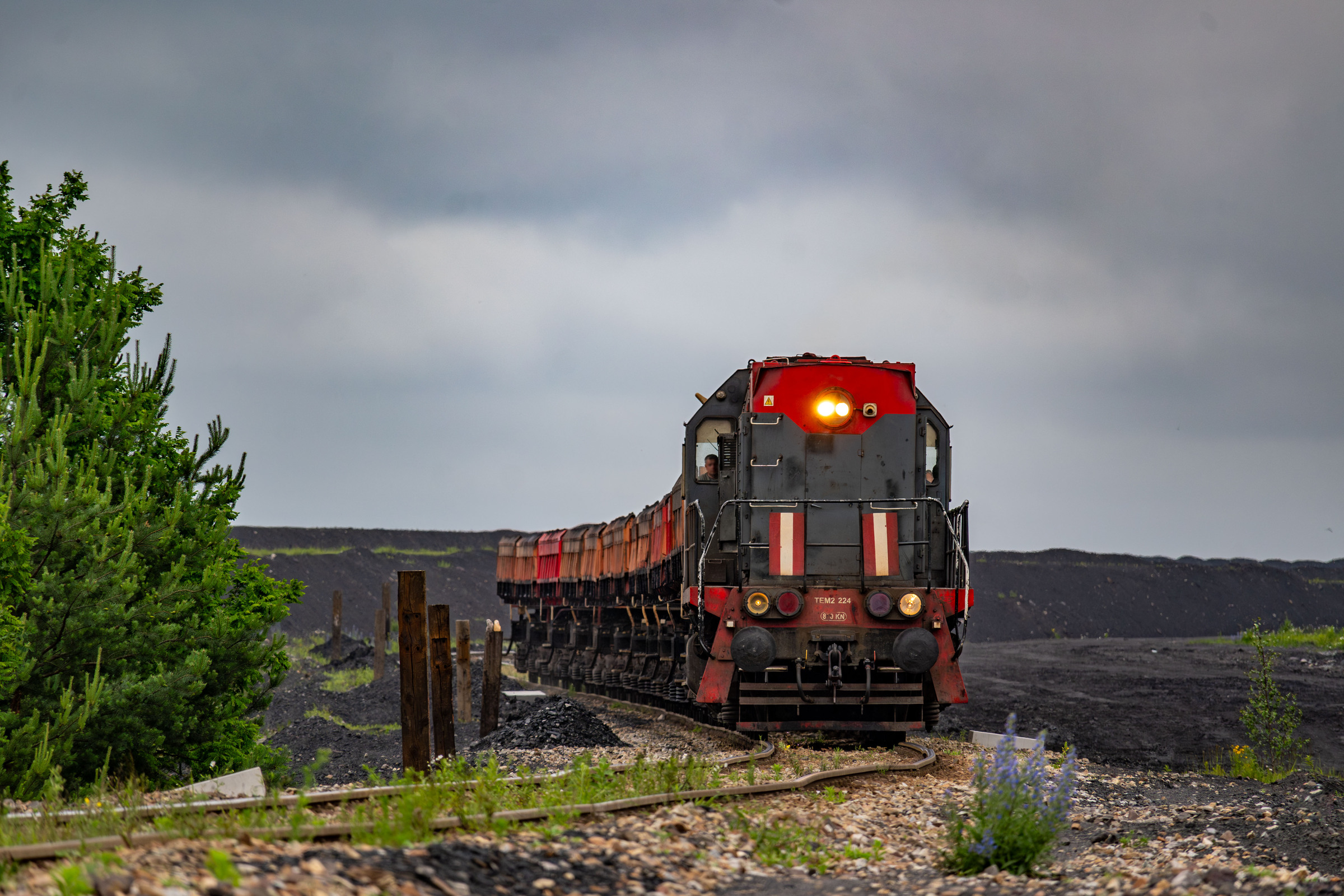 TEM2-224 JSW zjeżdża ze składem pustych radwanów z CZOG'u w stronę stacji Knurów Zwałowisko, gdzie docelowo uda się z powrotem na KWK Budryk.