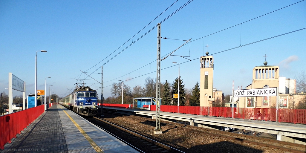 Pociąg relacji Łódź Kaliska - Warszawa Wschodnia za chwilę minie przystanek osobowy Łódź Pabianicka. Przystanek powstał w ramach Łódzkiej Kolei Aglomeracyjnej. Na zdjęciu widoczny modernistyczny kościół św. Franciszka z Asyżu a za nim w tle kominy EC2.Dodano: 09.01.2014 15:58
