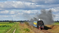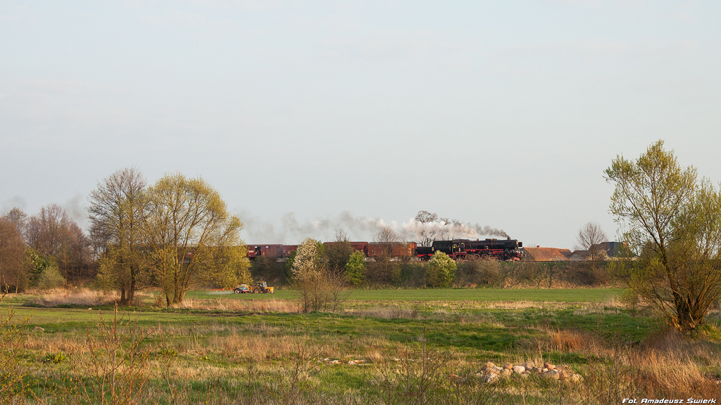 Ty42-24 z pociągiem specjalnym z Kępna do Wrocławia za chwilę osiągnie dawny przystanek osobowy w Poniatowicach. Obok życie toczy się normalnym tempem - lokalny rolnik opryskuje pola.