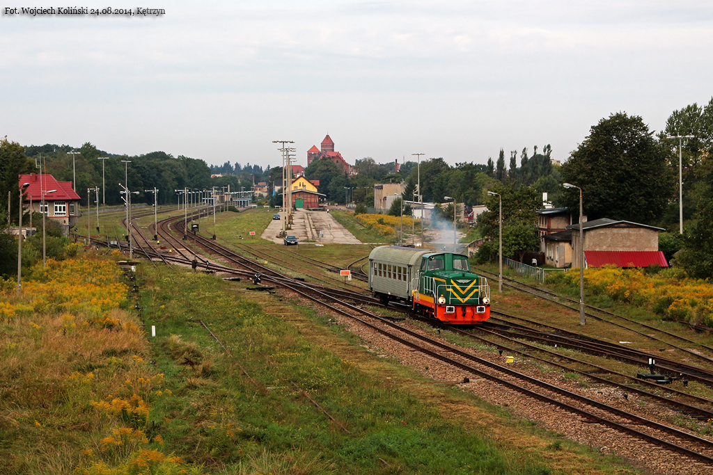 Pierwszy poranny pociąg turystyczny do Węgorzewa rusza ze stacji początkowej, składzik właśnie wtoczył się na linię 259.