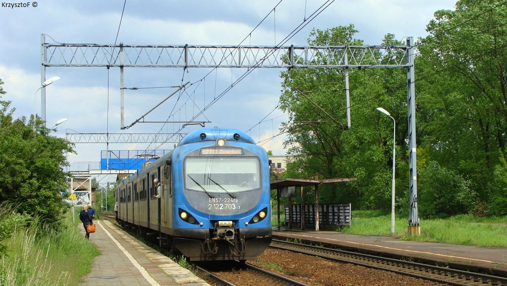 Zmodernizowana jednostka EN57-224 spółki Koleje Śląskie, uchwycona podczas planowego tego dnia postoju, na p.o.Katowice Piotrowice, na szlaku Katowice Ligota- p.odg.Mąkołowiec, z osobowym KS 49721 relacji Katowice- Zwardoń.