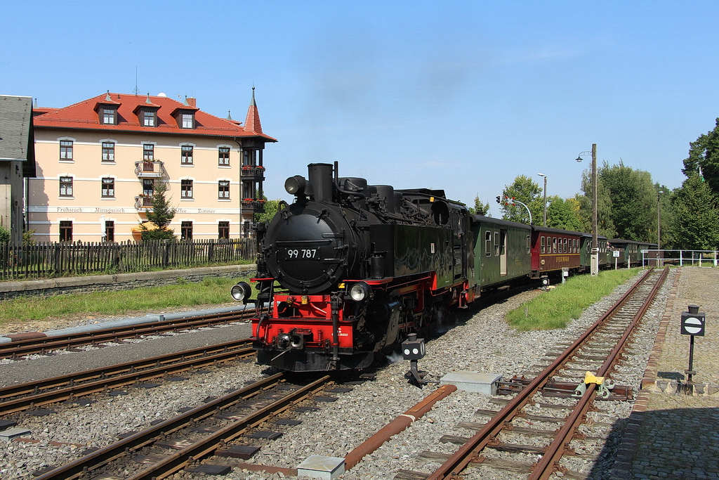 Parowóz 99 787 wjeżdża na stację Bertsdorf. W tle hotel "Bahnhof Bertsdorf" z niewątpliwie pięknym widokiem.
