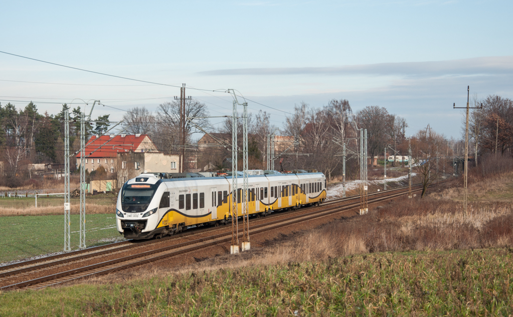 Pociąg kolei Dolnośląskich nr 69275 relacji Wrocław Główny - Szklarska Poręba Górna mija wieś Nowy Jaworów i pędzi do Świebodzic.