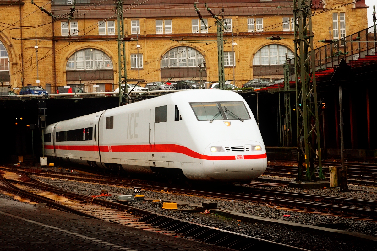 Pociąg Deutsche Bahn typu ICE1 wyłaniający się z hali dworca głównego w Hamburgu. Ściana budynku dworca częściowo widoczna w tle.