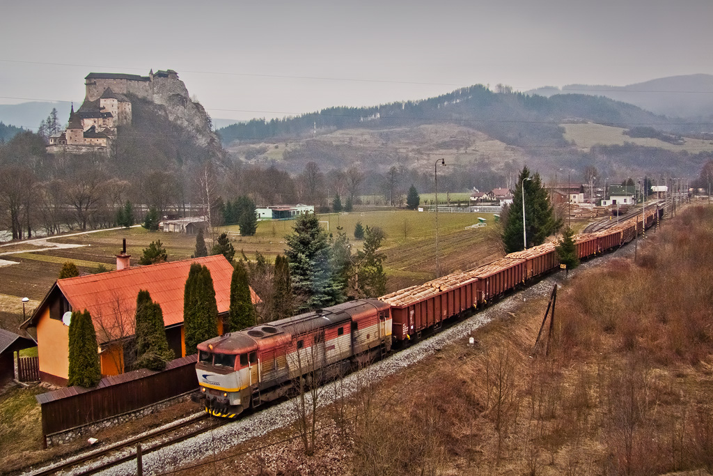Bardotka 751 191-8 ze zdawką ze stacji Trstená do Kraľovan, opuszcza stację Oravský Podzámok. W tle zamek Oravský Hrad.