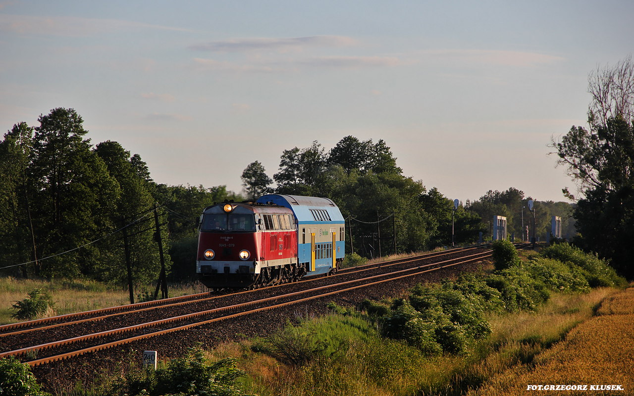 Ciekawostka tego dnia w postaci SU45-079 z pociągiem regio relacji Kostrzyn-Krzyż. Zdjęcie wykonane na szlaku Nowe Drezdenko-Krzyż. Na drugim planie most nad rzeką Drawa.