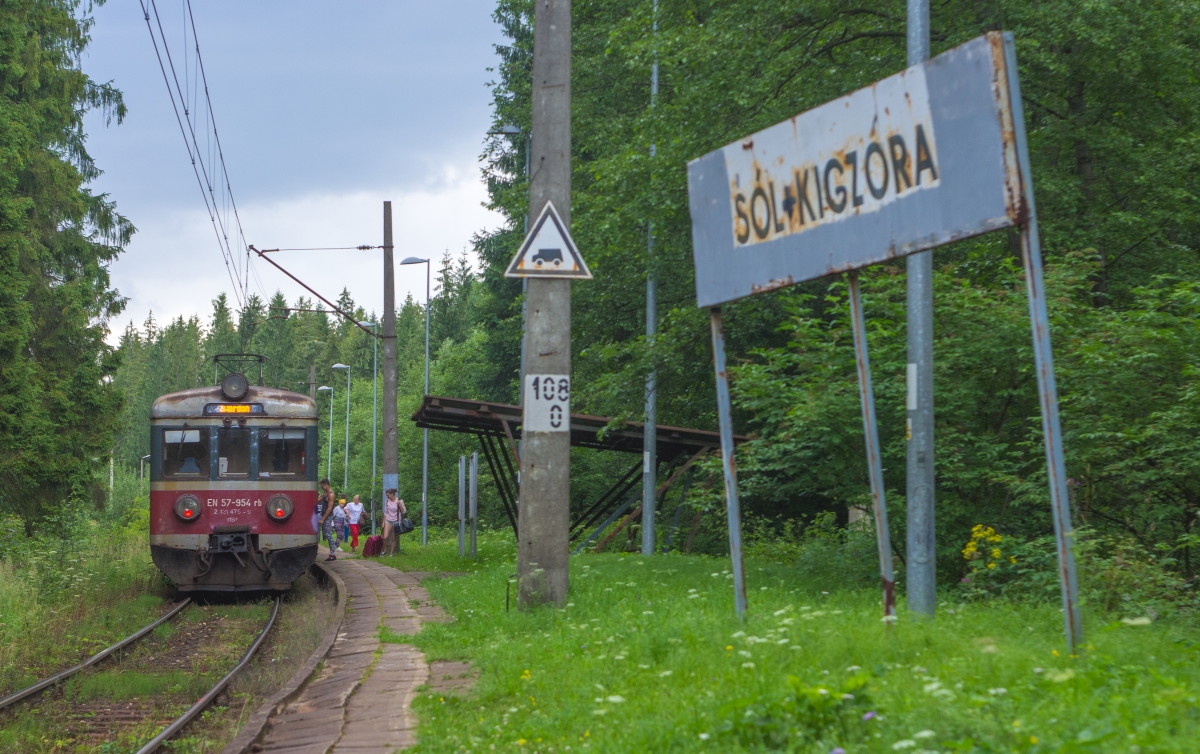 EN57-954 właśnie zatrzymał się na przystanku Sól-Kiczora, dowożąc do celu kilku pasażerów, którzy rozpoczynają beztroskie wakacje w Beskidzie Żywieckim. Sól-Kiczora to jedna z kilku stacji na linii 139, która mieści się po prostu w lesie.