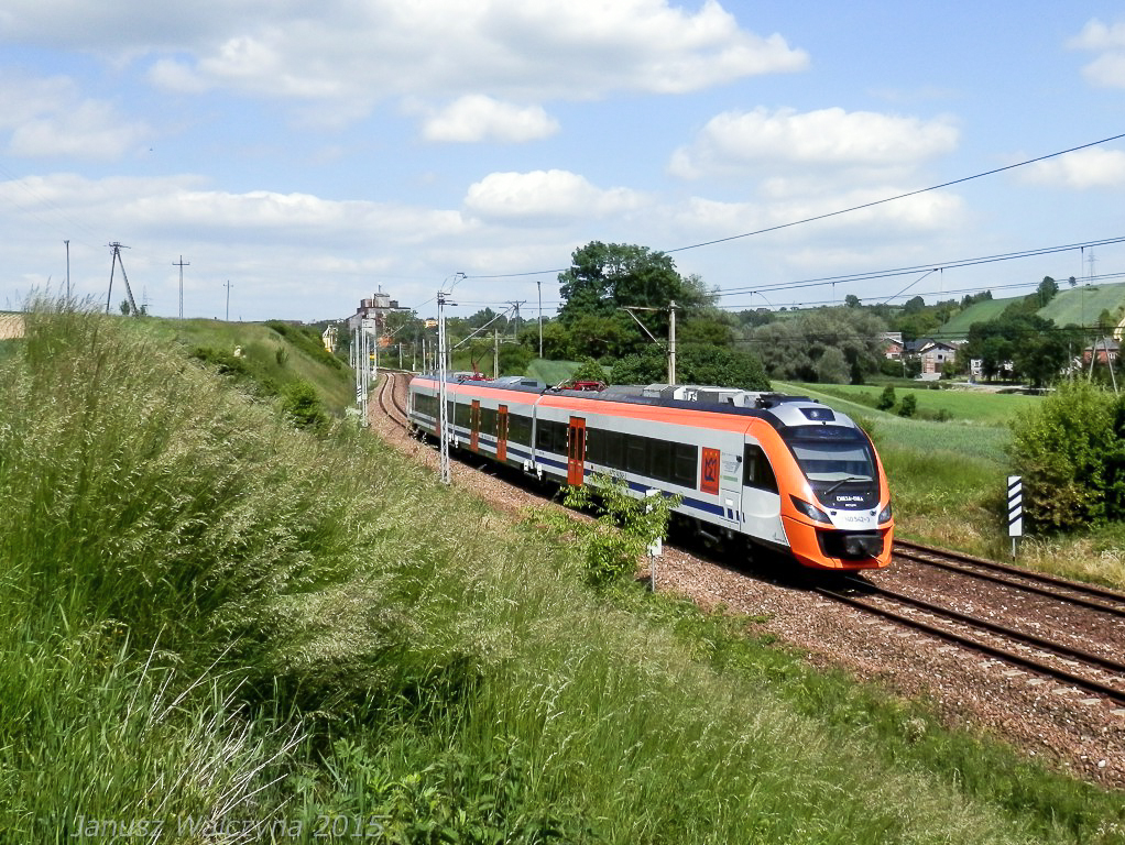 EN63A-018 chwilę po wyjeździe ze stacji Miechów. Pociąg jedzie jako R 23315 w relacji Kielce - Kraków Główny
