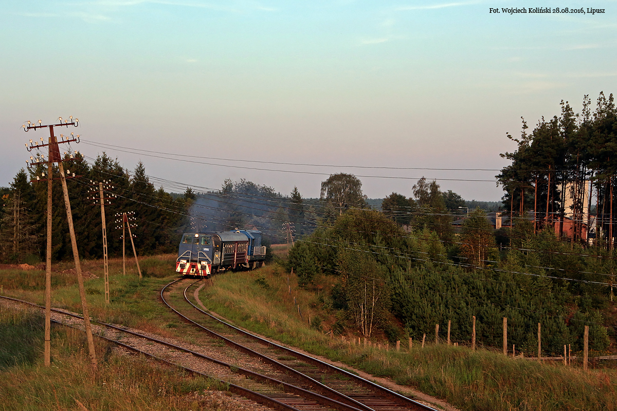 Ostatni (tego dnia) pociąg turystyczny z Lipusza do Bytowa wyruszył w trasę, jedzie jednym z ramion lipuskiego trójkąta. Na końcu składu jest T458-1509 (Hektor), którego czołowy "maluch" dociągnie tylko do "Prefabetu" Osława Dąbrowa.