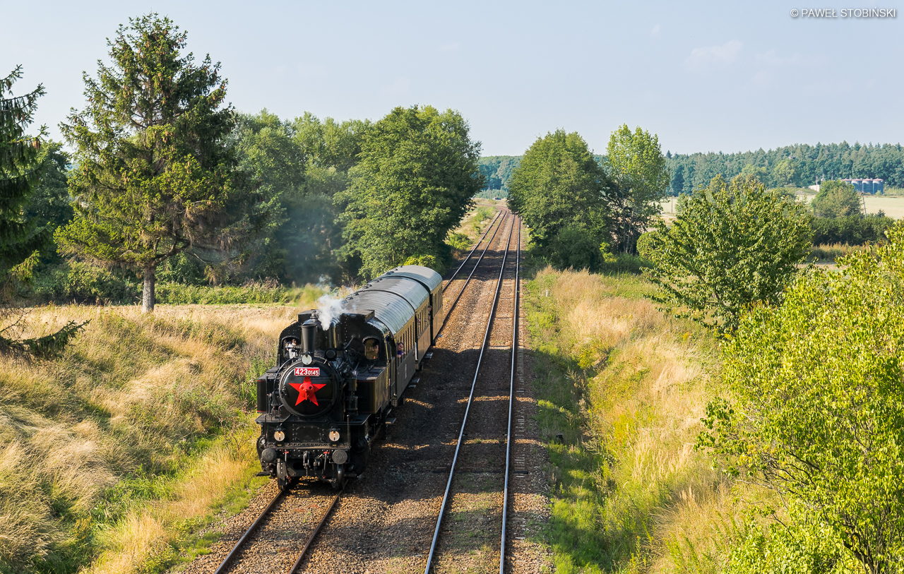 Czeski parowóz 423.0145 z Jaromierza z pociągiem retro "Nora" relacji Jaworzyna Śląska - Świdnica podąża dwutorowym szlakiem w kierunki Świdnicy. Przejazd został zorganizowany z okazji odbywającej się w ten weekend w Jaworzynie VI Gali Parowozów. Pociągi specjalne do Świdnicy i Mościska Dzierżoniowskiego prowadzone były lokomotywami: TKt48-18, TKt48-191 oraz czeskim 423.0145, natomiast poranne retro z Wrocławia do Jaworzyny oraz do Wałbrzycha prowadziła wolsztyńska Pt47-65 (pierwotnie do Wałbrzycha miał jechać Ty42-24, ale z powodu defektu pojechała "Petucha"). Na imprezie zaprezentowała się jeszcze lokomotywa 213.901 z Brna. Po wykonaniu powyższej fotografii wraz z ekipą pojechaliśmy do Rogoźnicy, gdzie na odjazd w kierunku Jaworzyny oczekiwały dwa Rumuny: ST43-108 i ST43-325, które dzięki wyjazdowi grubo przed planem (wyjechały o 17, plan był na 19) udało się jeszcze dorwać w kilku miejscach na szlaku. Pogoda dopisywała przez cały dzień, zatem wypad można uznać za baaardzo udany.