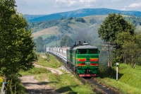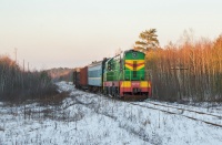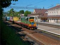 Skład z urobkiem rudy żelaza z Glejwatskiego kamieniołomu zmierza w stronę kombinatu metalurgicznego. Na uciągu pracuje 2ТÐ10М-0077, którą ledwo widać w kłębach dymu, na popychu zaś 2ТÐ10М-0991.