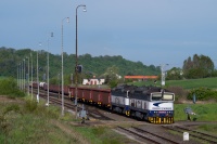 ET22-807 w podwójnej trakcji wraz z niezidentyfikowaną lokomotywą ST44 ciągnie skład pustych węglarek przez stację w Pruszczu Gdańskim.