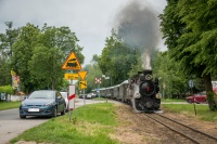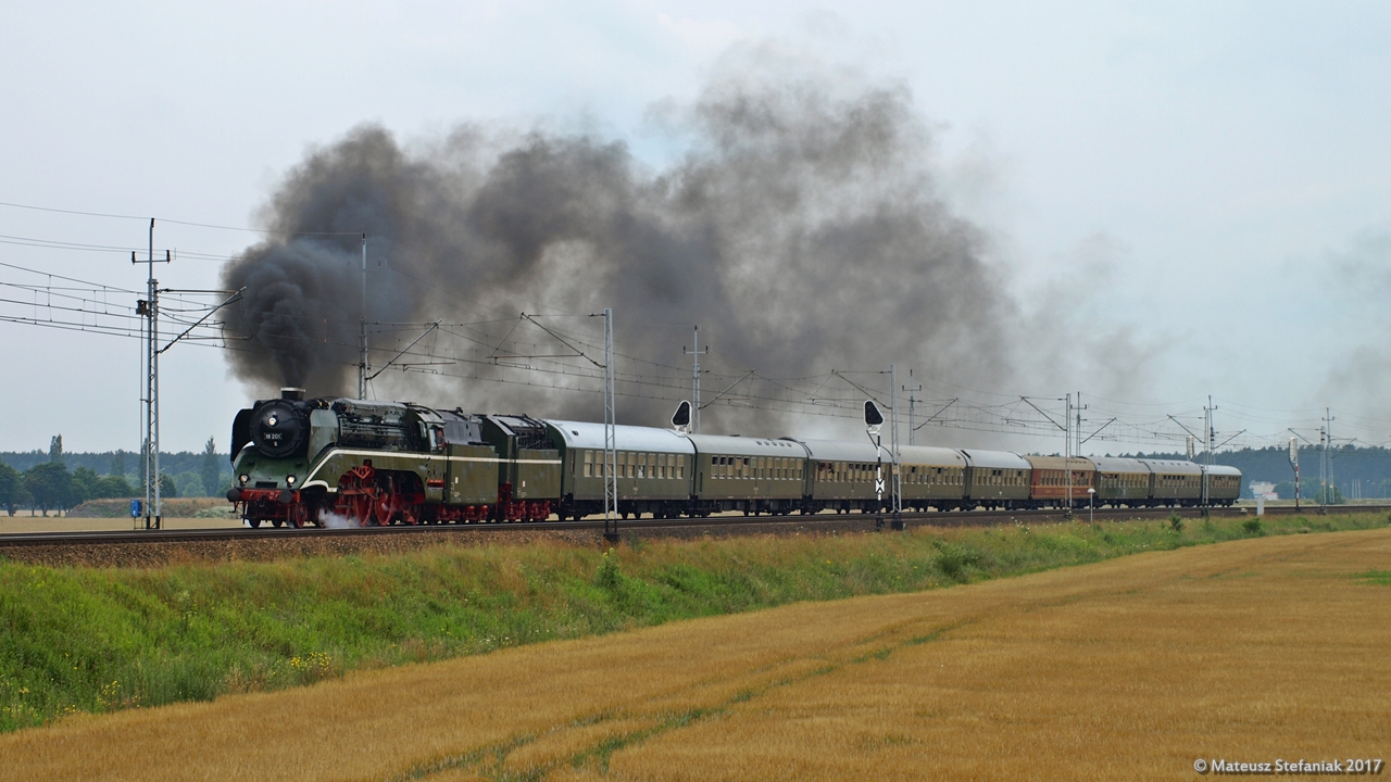 Niemiecki parowóz BR18 201 z pociągiem specjalnym z Lipska do Poznania mknie przez Boczów i za chwilę minie się z planowym pociągiem BWE do Berlina.