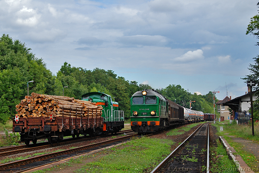 ST44-949 z pociągiem TNGS 7891 relacji Poznań Franowo PFB - Kostrzyn KOA mija na biegu stację Nowe Drezdenko. SM42-882 z pociągiem 4492 do Krzyża czeka na zwolnienie odstępu przez pośpiecha (chyba Kopernika), który nieco wcześniej odjechał z SU45-245.