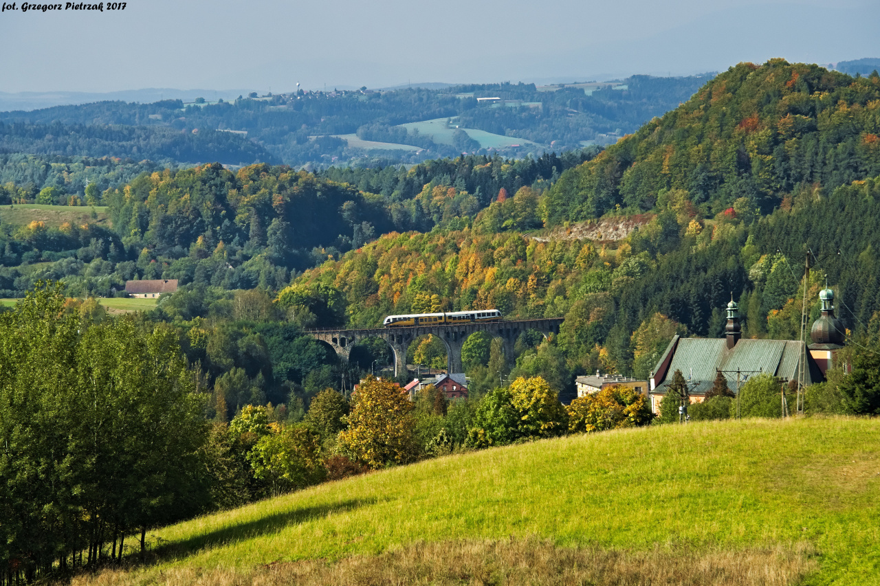 29.09.2017 Lewin Kłodzki II SA134 II Jak pamiętamy koniec września w Kotlinie Kłodzkiej był bardzo ciepły i słoneczny. Podczas spaceru po Wzgórzach Lewińskich w pewnej chwili ukazał się zapierający dech w piesiach widok... W dole widoczne zabudowania Lewina Kłodzkiego, powyżej którego góruje słynny wiadukt kolejowy na LK 309, po którym jedzie szynobus KD 69318 relacji Kudowa Zdrój - Wrocław Główny. Pociąg za chwilę wjedzie do tunelu pod widocznym z prawej strony Wzgórzem Szubieniczna (502 m n.p.m.), by kontynuować swoją mozolną wspinaczkę aż do połowy tunelu kolejowego w okolicach Kulina Kłodzkiego. Dalej w stronę Dusznik będzie już tylko z górki...