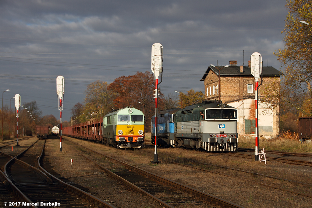Ale piękny tabor. Od lewej - skład brązowych węglarek z węglem brunatnym, skład 3 wagonów serii H, SU46-047 z pociągiem Swarzędz-Mlada Boleslav oraz luzakujące okularniki z 750 277-6 na czele, a po prawej kawałek brązowej węglarki.
