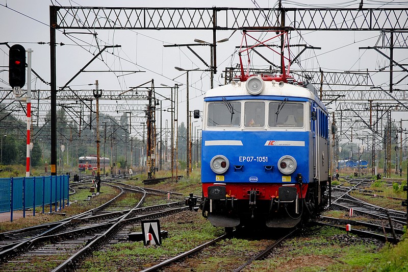 30.08.2010 |Łódź Kaliska| EP07-1051 w odświeżonym malowaniu (dostał paski z logiem PKP InterCity) manewruje od pociągu TLK61107 Wrocław Gł.- Warszawa Wsch.