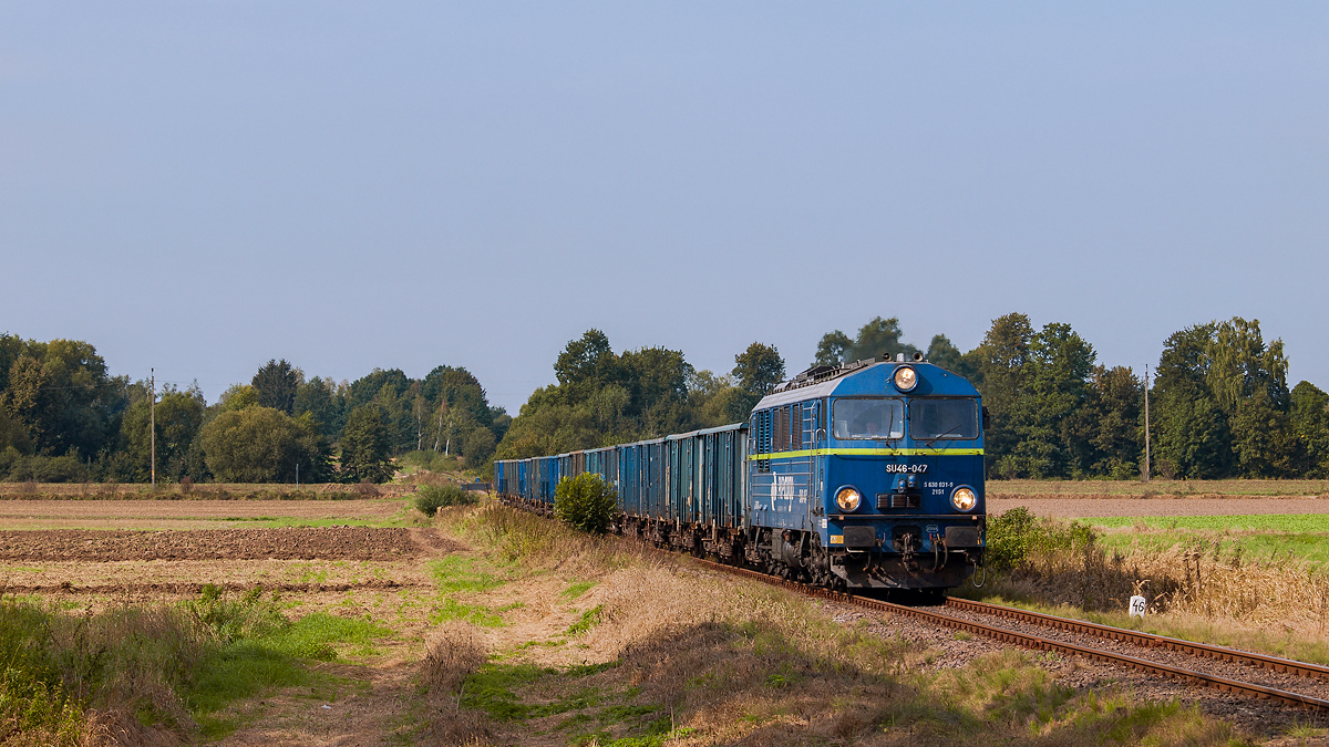 Suczka na czele pociągu towarowego z Węglińca do Niwnic jedzie szlakiem Zebrzydowa - Nowogrodziec. W składzie jadą puste węglarki pod załadunek kruszywa w Rakowicach Wielkich.