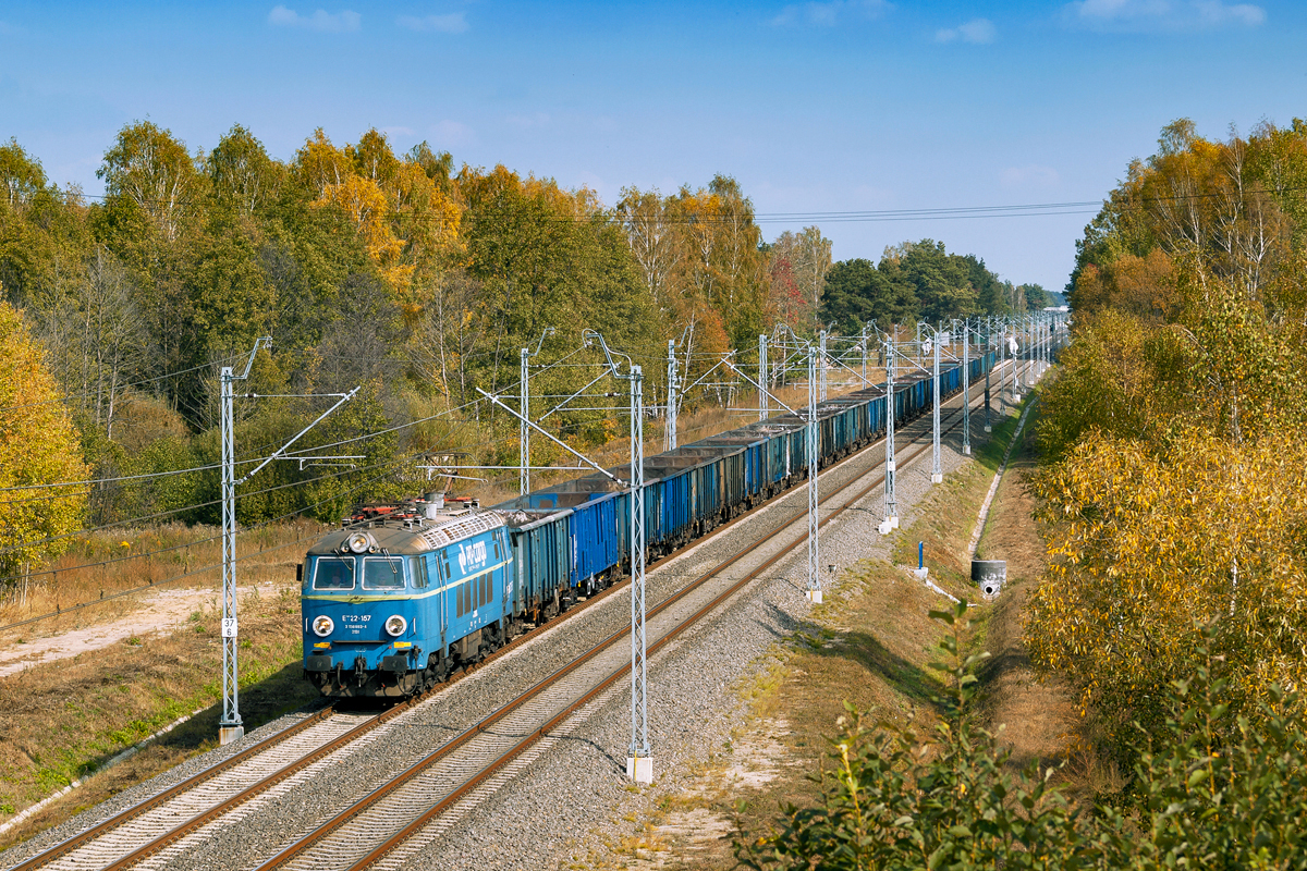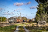 Nieco wypłowiały byk na czele próżnych węglarek z Jeziornej do Rybnika Towarowego jedzie szlakiem Grodzisk Mazowiecki - Żyrardów.