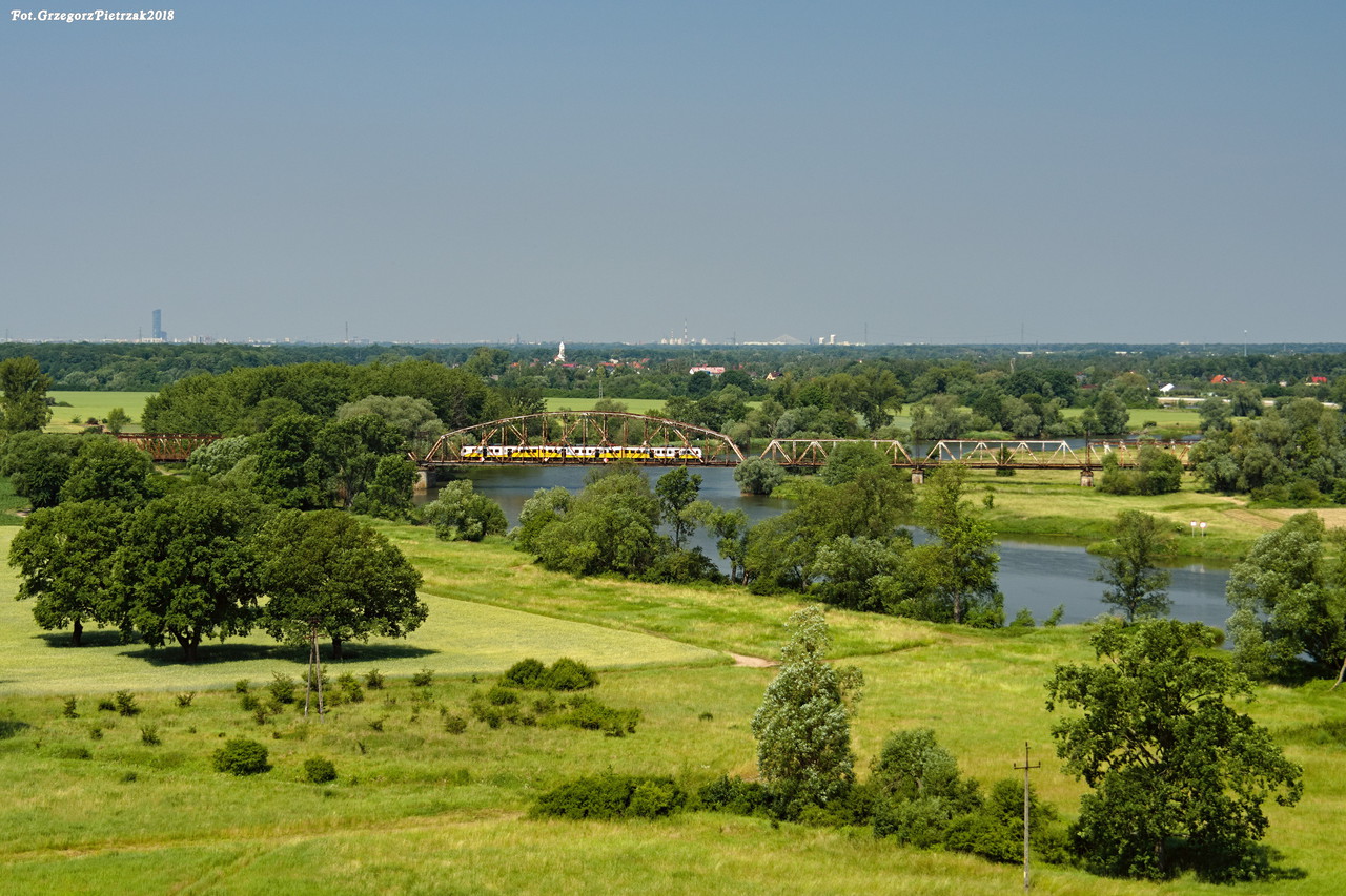 Godz: 11:15 Kotowice II EN57 II. Tak prezentuje się widok z 40 metrowej wieży widokowej w miejscowości Kotowice... Wieża powstała w 2012 roku, wstęp na nią jest całkowicie darmowy i dostępny w godzinach 10:00 - 20:00. Na zdjęciu pociąg KD 69712 relacji Wrocław Główny - Jelcz Laskowice przejeżdża przez zespół mostów nad Odrą zbliżając się do stacji Czernica Wrocławska. W górnej części kadru widoczny jest Sky Tower, najwyższy budynek we Wrocławiu, elektrociepłownia, Most Rędziński i oczywiście Kredka i Ołówek :-)