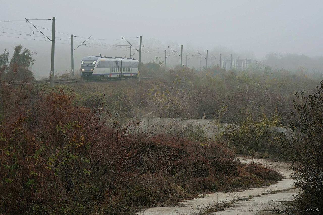 Szare, ciemne i ponure popołudnie. Desiro jak pociąg CFR nr R-9347 relacji BucureÈ™ti - Giurgiu zbliża się do przystanku Grădinari. W tle (chyba) widać most nad rzeką ArgeÈ™, która wyznacza granicę między okręgami Giurgiu i Ilfov.
