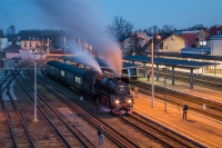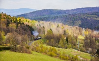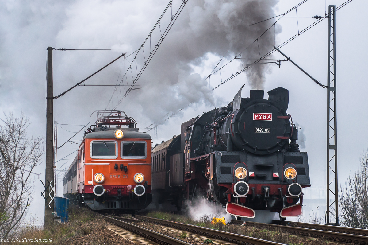 EP05-23 oraz Ol49-69 opuszczają poznańską estakadę towarowej obwodnicy Poznania.