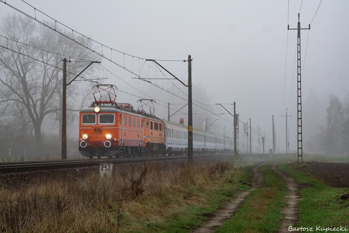 EP05-23 oraz EP08-001 czyli dwie historyczne maszyny prowadzą planowy pociąg 18101 IC "Gałczyński" z Warszawy Wschodniej do Szczecina Głównego. Skład na zdjęciu opuszcza, spowitą gęstą mgłą, stację Lipie Góry położoną na "Magistrali Węglowej". Motyw miał być zupełnie inny, ale ze względu na gęstą mgłę oraz składy towarowe stojące w stacji okazał się niemożliwy do wykorzystania.
