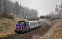 SU42-502 z bohunem w niebieskim malowaniu opuszcza Trzciankę w kierunku Biernatowa jako pociąg R 88481 z Piły do Krzyża.