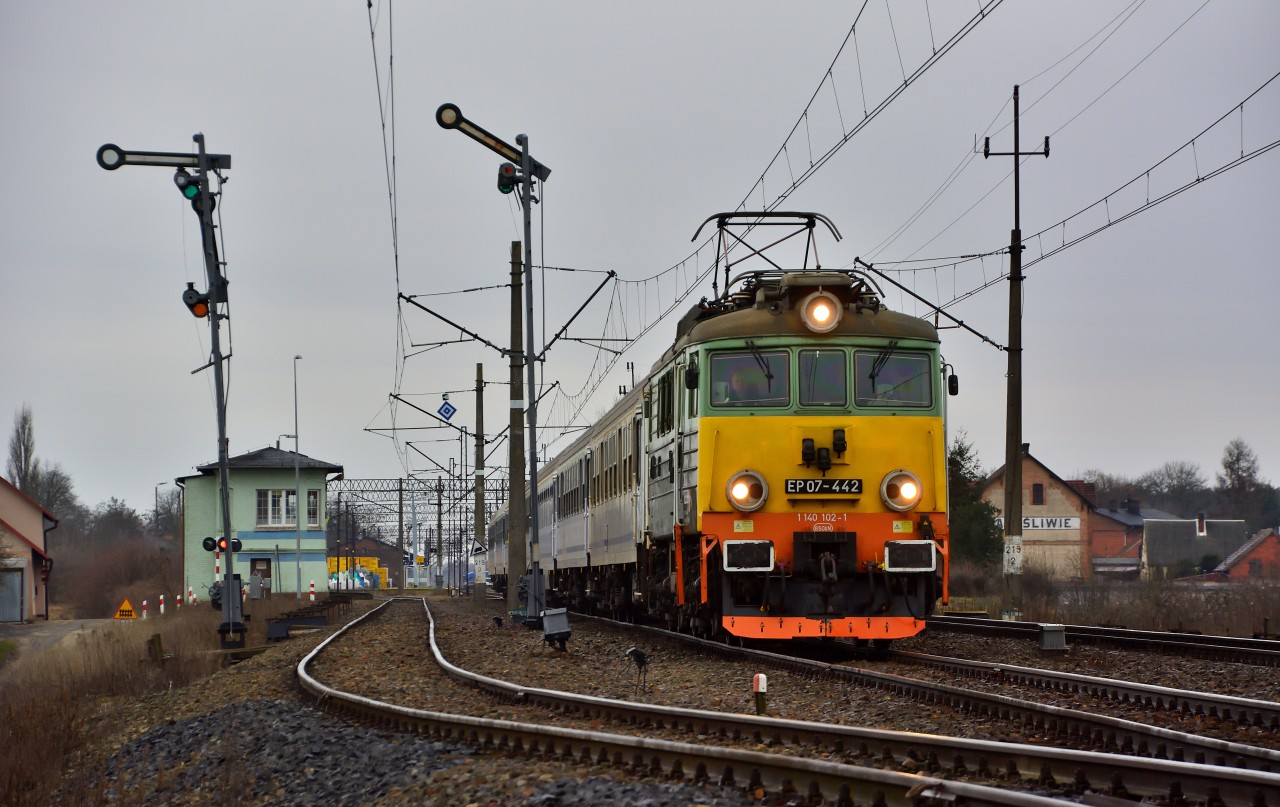 EP07-442 na czele pociągu TLK 82104 "Zamoyski"na biegu mija semafory wyjazdowe stacji Białośliwie w kierunku Bydgoszczy. Ostatnimi czasy lokomotywa ta często wpada mi w obiektyw, na co nie narzekam ;)