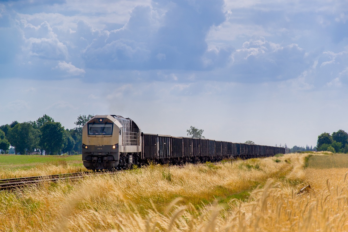 311D-02 z wahadłem węglarek relacji Rogoźnica-Koszalin, wyjechał z Trzcianki i zbliża się do przystanku w Białej Pilskiej.