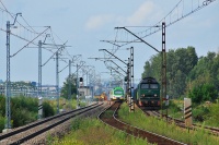ST44-360 wraz z ST44-399 prowadzą pociąg TME 154016/7 relacji Papiernia - Bydgoszcz Wschód Tow. Skład mija Niedźwiedzkie i kieruje się w stronę Olecka, skąd do Ełku na czele pociągu pojedzie ST44-399.